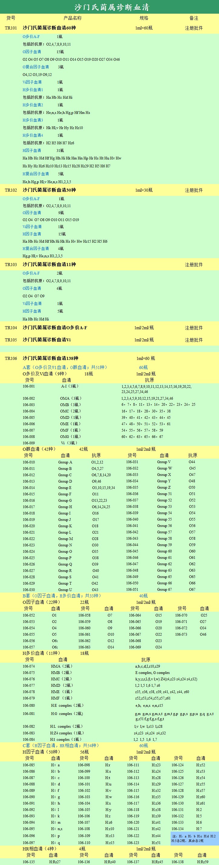 診斷菌液(肥達(dá)氏、外斐氏試劑)有傷寒、副傷寒及變形菌 OX19 、 OX2 、 OXK 診斷菌液,用于肥達(dá) - 外婓氏試驗(yàn)。