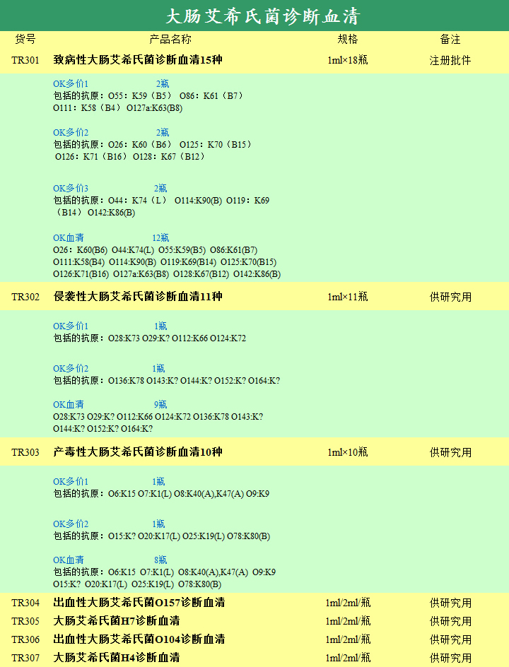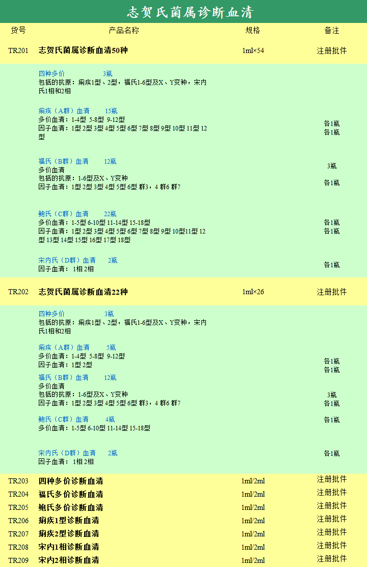 診斷血清(凝集法)主要有沙門氏菌屬診斷血清、志賀氏菌屬診斷血清、大腸艾希氏菌診斷血清、霍亂弧菌診斷血清等。品種、規(guī)格齊全,主要用于腸道疾病的輔助診斷、流行病學(xué)調(diào)查及科學(xué)研究。