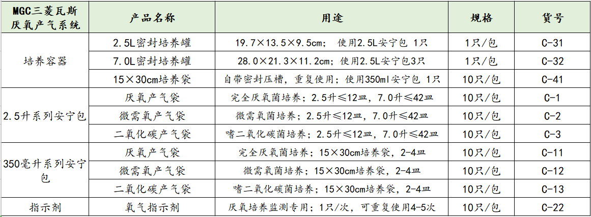 目前,MGC AnaeroPack系列產(chǎn)品有厭氧培養(yǎng)、微需氧培養(yǎng)、二氧化碳培養(yǎng)三大類,2.5升和350毫升兩個系列以及配套的密封培養(yǎng)罐、培養(yǎng)袋和氧氣指示劑。